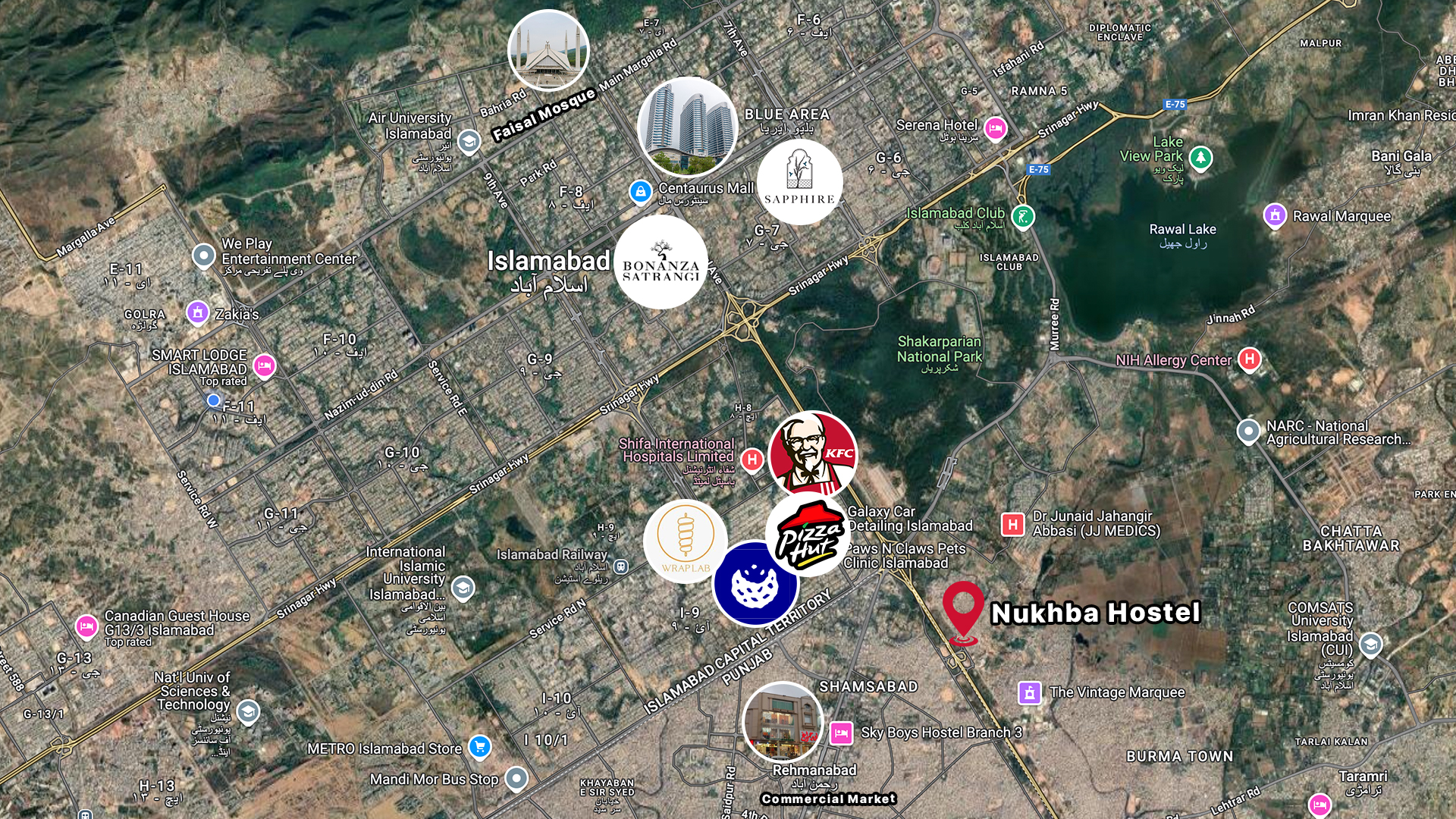At Nukhba, we understand that good food is essential for a satisfying stay. Fortunately, our hostel is only 9 minutes away from I-8 Markaz that includes Ranchers, KFC, Pizza Hut, Cheezious, Arab Mandi, Habibi and Butt Karahi, Nazarr and many more.